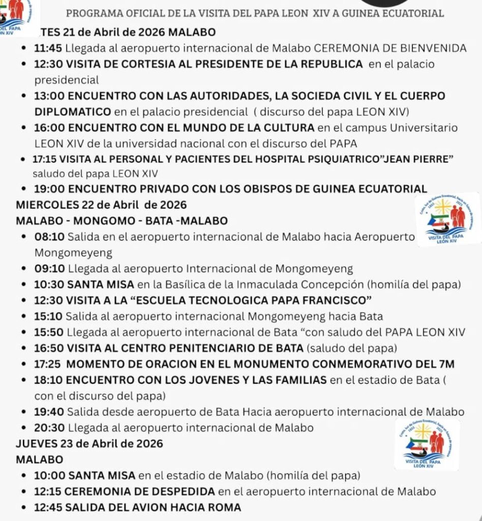 Según el programa oficial, el Pontífice aterrizará en el Aeropuerto Internacional de Malabo este martes 21 de abril de 2026 a las 11:45 horas, donde será recibido con una solemne ceremonia de bienvenida organizada por el Gobierno y la Iglesia Católica local.