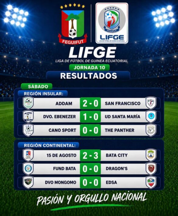 Mientras tanto, en la región continental, el partido más destacado lo protagonizaron 15 de Agosto y Bata City, con triunfo visitante (2-3) en un choque vibrante y cargado de alternativas. En otros resultados, Fund Bata y Dragon’s no pasaron del empate (0-0), al igual que DVO Mongomo y EDSA, que también sellaron un empate sin anotaciones.