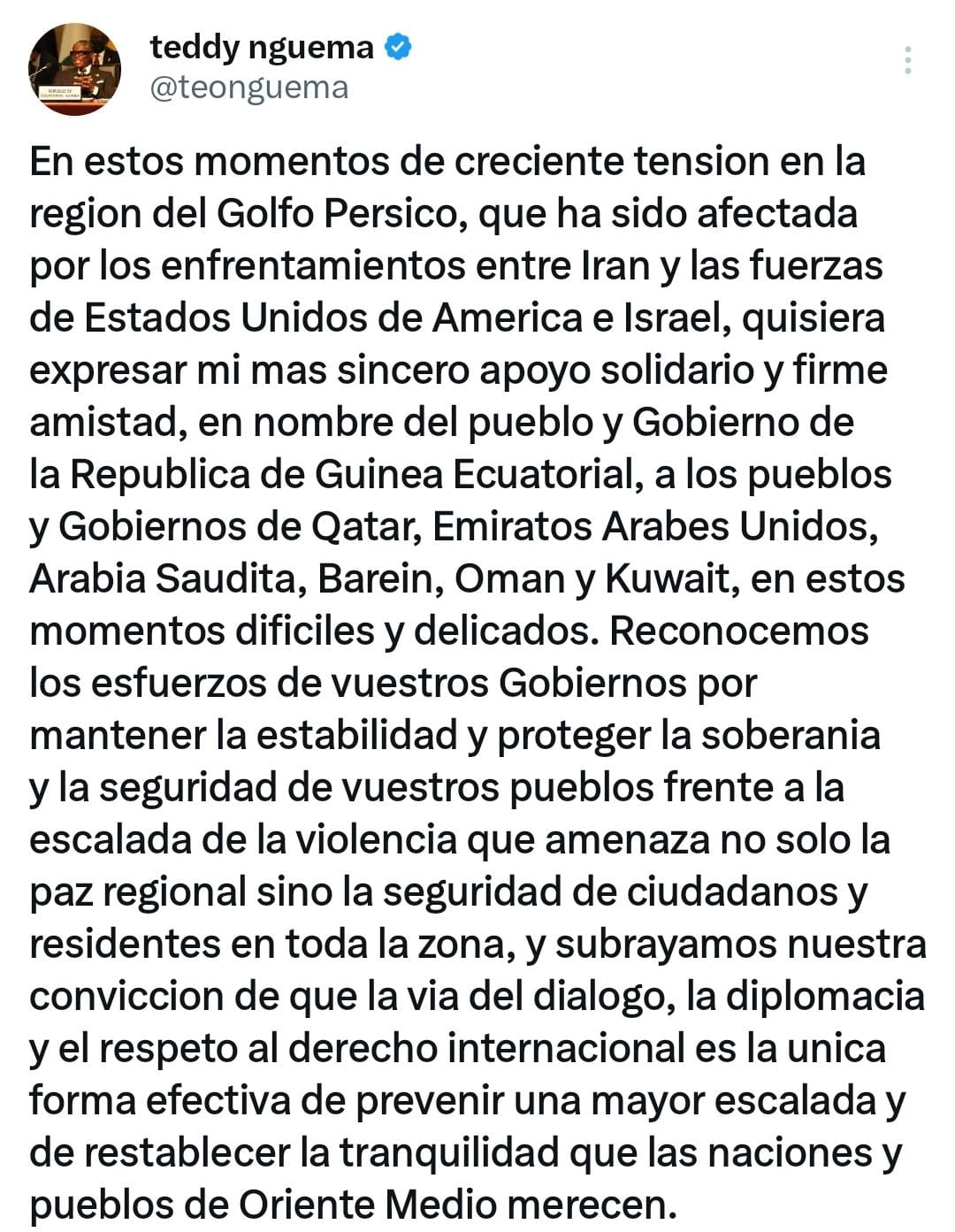 A través de una declaración pública, el alto dirigente ecuatoguineano manifestó, en nombre del pueblo y del Gobierno de la República de Guinea Ecuatorial, su apoyo a los pueblos y gobiernos de Qatar, Emiratos Árabes Unidos, Arabia Saudita, Baréin, Omán y Kuwait, ante la situación derivada de los enfrentamientos que involucran a Irán, Estados Unidos e Israel.