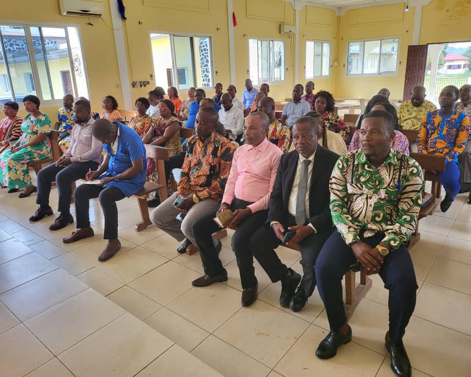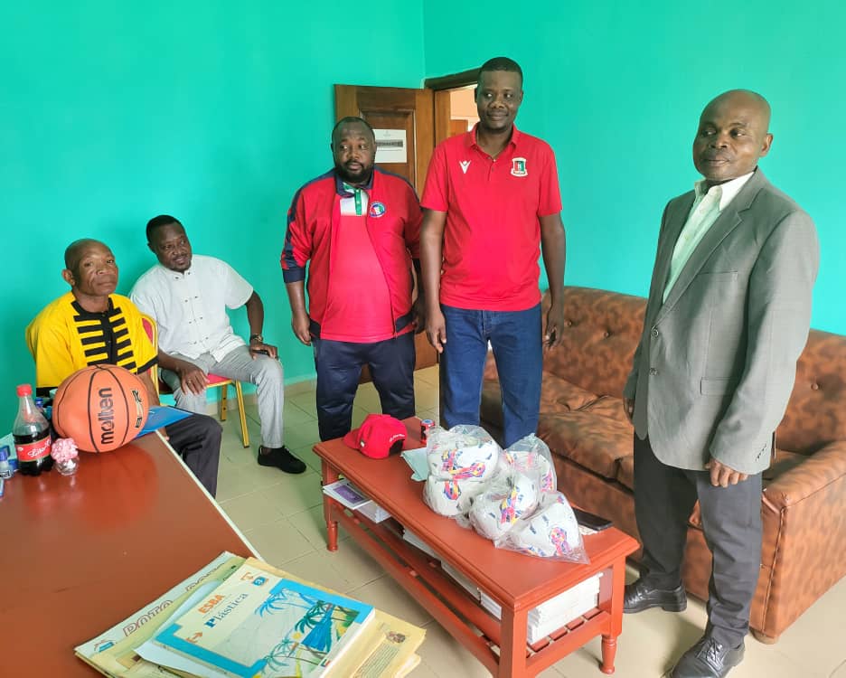 En Akonibe, la FEGUIDE realizó la entrega de cinco balones, material administrativo, un sello oficial y los nombramientos correspondientes al Presidente de la Asociación Distrital de Deporte Escolar, reforzando así la estructura organizativa local.