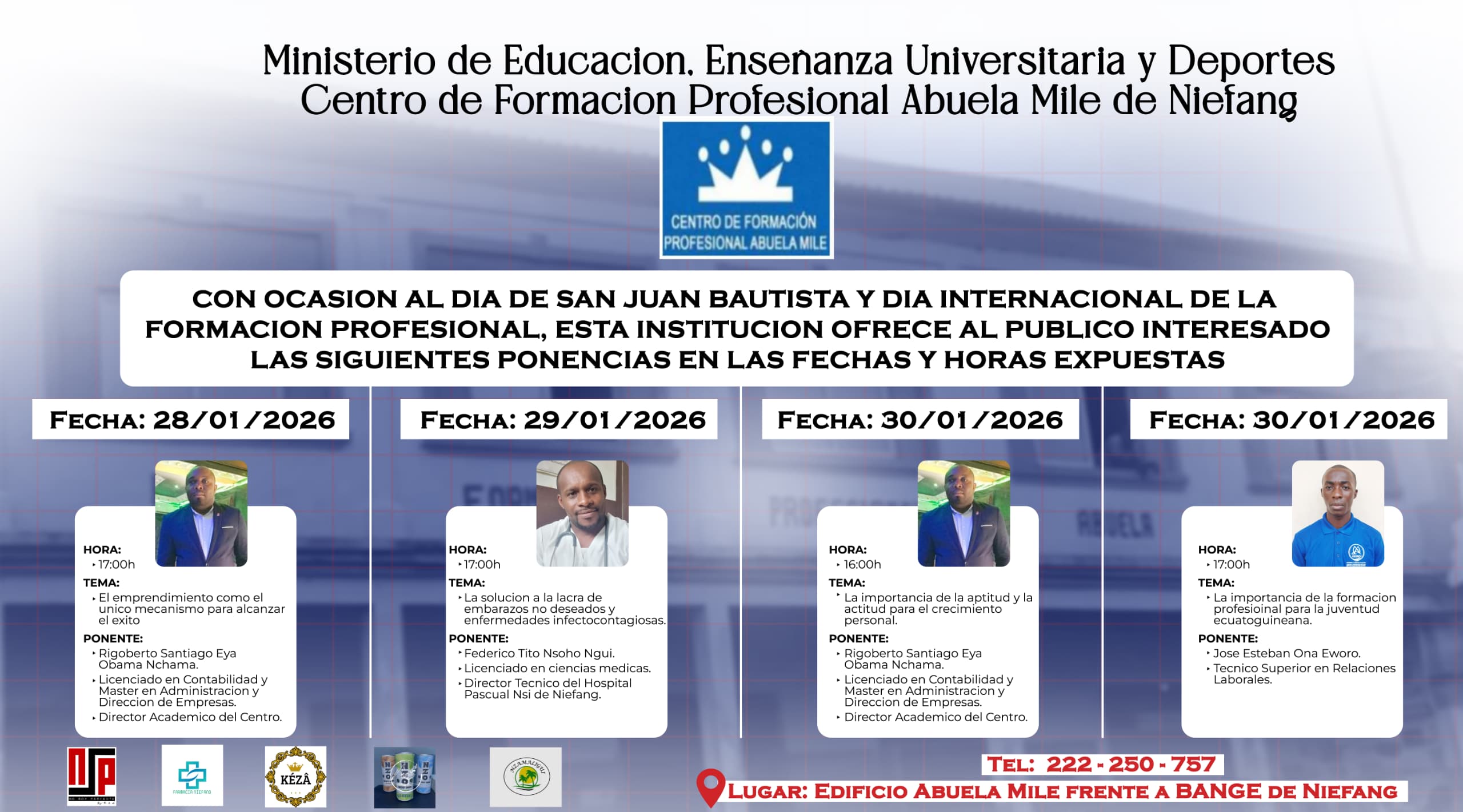 En el marco de la festividad de Don Bosco y del Día Internacional de la Formación Profesional, el Centro de Formación Profesional Abuela Mile de Niefang, dependiente del Ministerio de Educación, Enseñanza Universitaria y Deportes, ha organizado una serie de ponencias formativas dirigidas al público interesado, que se desarrollarán del 28 al 30 de enero de 2026 en la ciudad de Niefang.