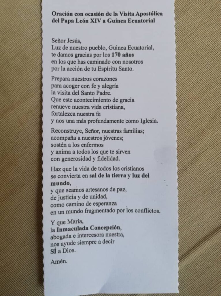 En el marco de los preparativos para la anunciada Visita Apostólica de Su Santidad el Papa León XIV a Guinea Ecuatorial, ha sido difundida la oración oficial que acompañará espiritualmente este histórico acontecimiento para la Iglesia y el pueblo ecuatoguineano.
