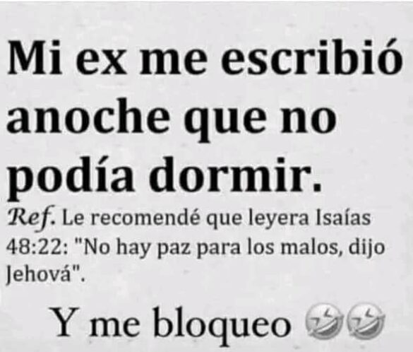 Una imagen que circula en redes muestra el siguiente mensaje: alguien cuenta que su expareja no podía dormir y, como respuesta, le recomienda leer un versículo bíblico que afirma que no hay paz para quienes actúan mal. La situación termina con un bloqueo y un tono humorístico que provoca carcajadas entre los usuarios.