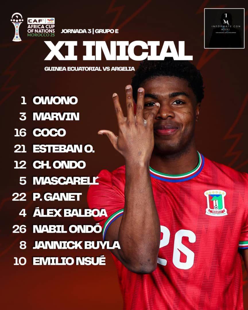 Todo listo. Guinea Ecuatorial ya tiene XI inicial para afrontar su último partido en Marruecos, correspondiente a la Jornada 3 del Grupo E de la CAN 2025, frente a Argelia.